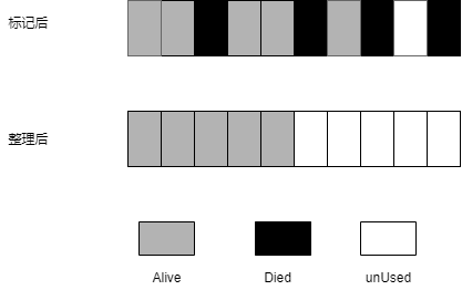 和Mark-Sweep的差别是,Mark-compact标记完成后,在整理过程中会将活着的对象往一端移动,移动完成后,直接清理掉边界外的内存。