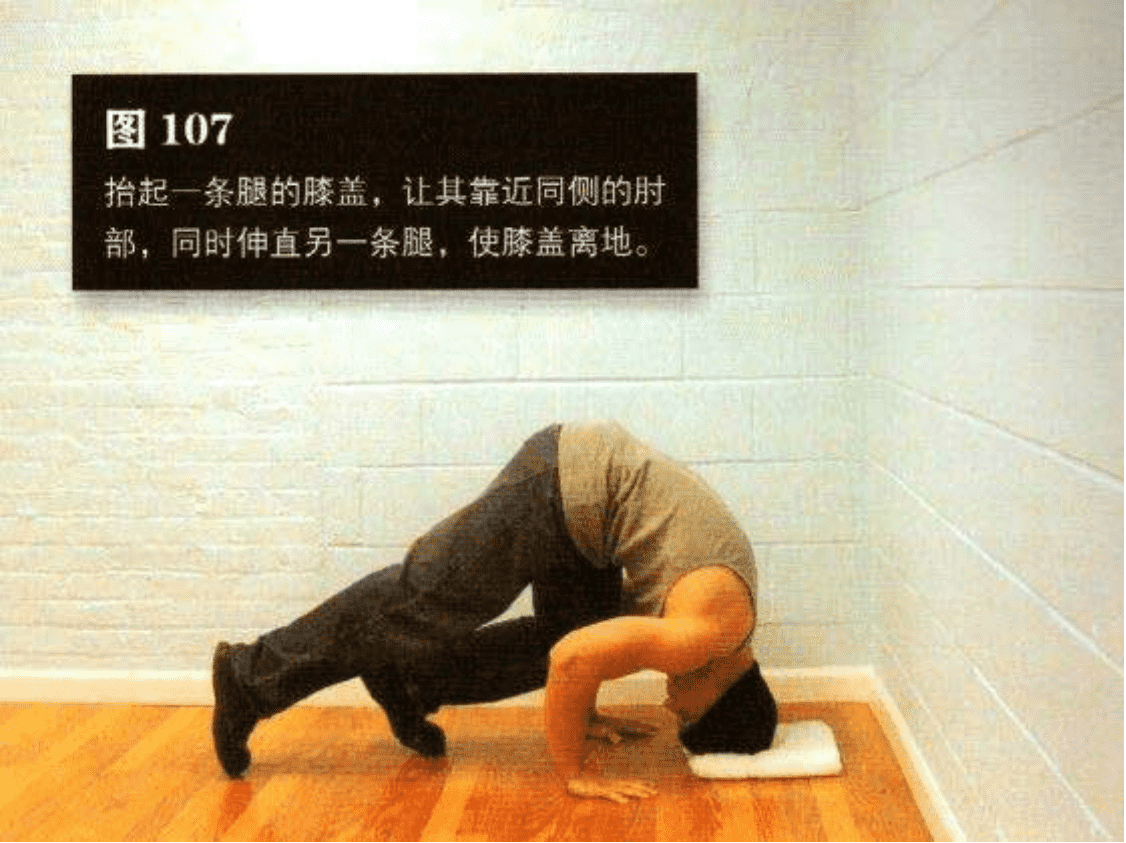 抬起一条腿的膝盖,让其靠近同侧的肘部,同时伸直另一条腿,使膝盖离地(图 107)。