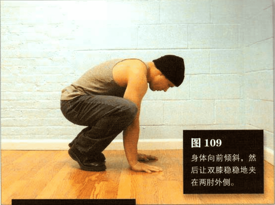 双手手掌放在身体 前面的地板上,与肩同宽。双臂略微弯曲,身体 向前倾斜,然后让双膝稳稳地夹在两肘外侧(图 109)。