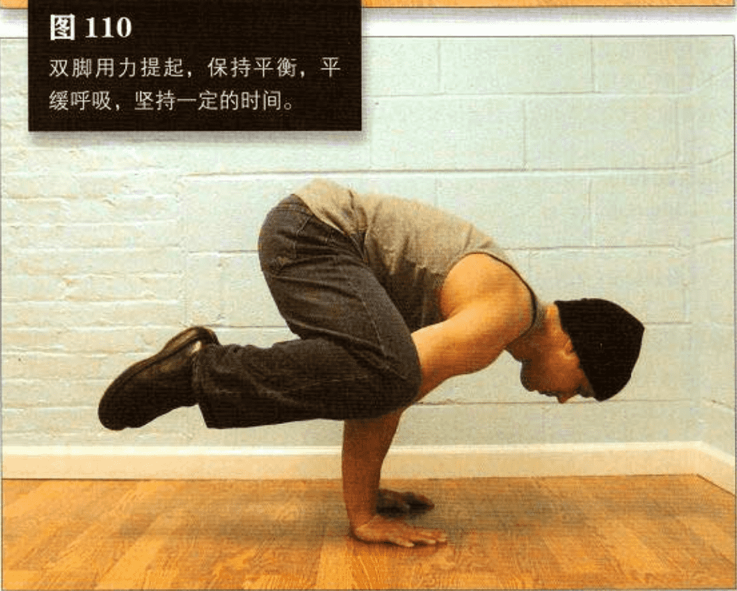 最终重心前 移,双脚离地。双脚用力提起,保持平衡,平缓 呼吸,坚持一定的时间(图 110)。