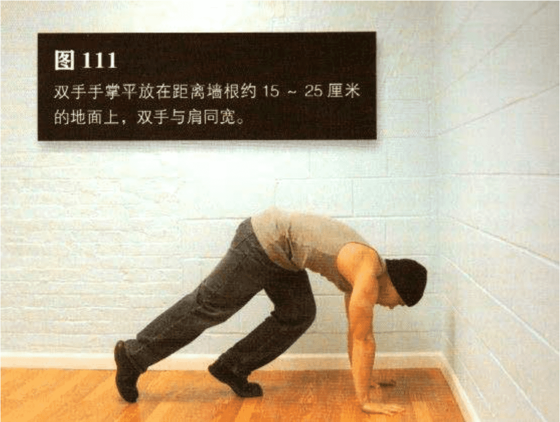 找一面墙,双手手掌平放在距离墙根约 15- 25 厘米的地面上,双手与肩同宽。