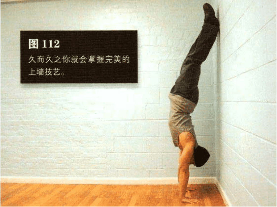然后,让靠近肘 部的腿使劲蹬地,同时将另一条腿向上踢,从而让两条腿同时靠向墙壁。