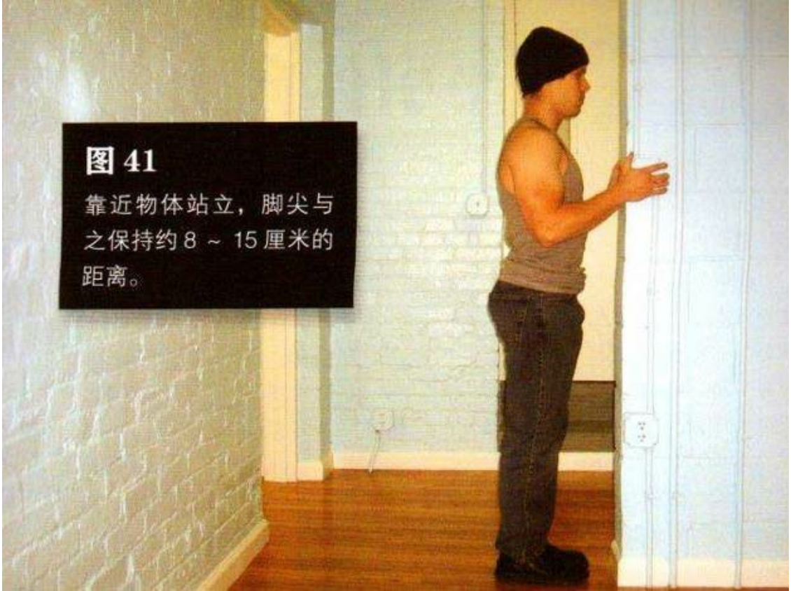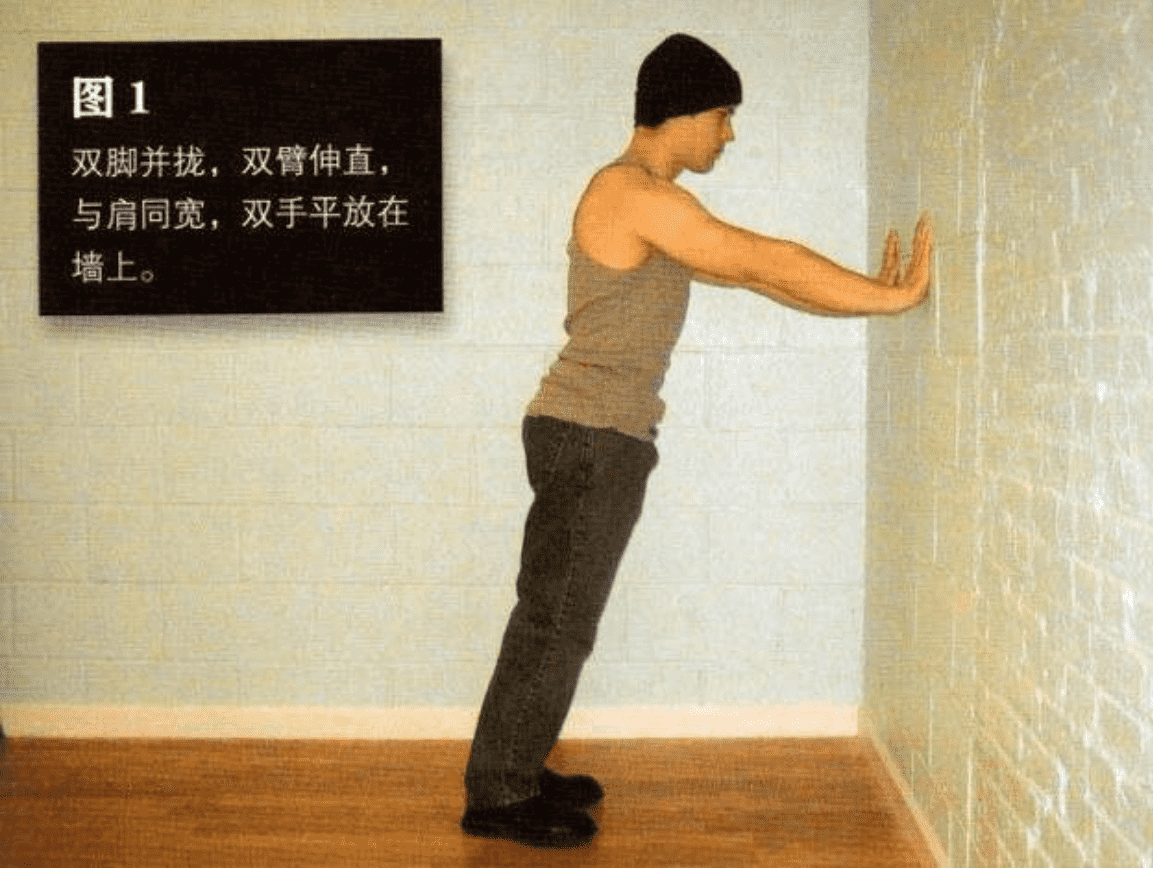 面对墙壁站立,双脚并拢,双臂伸直,与肩 同宽,双手平放在墙上,手掌与胸等高。这是该 动作的起始姿势(图 1)。
