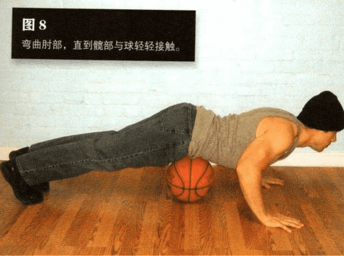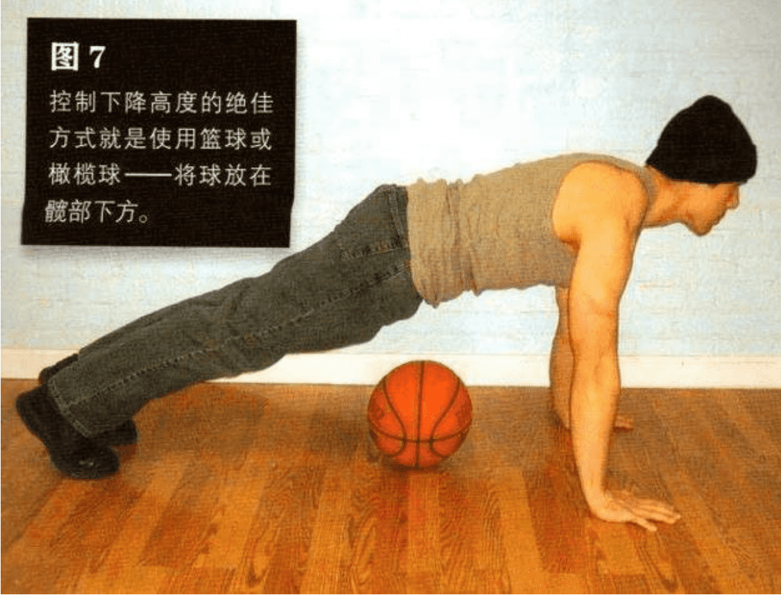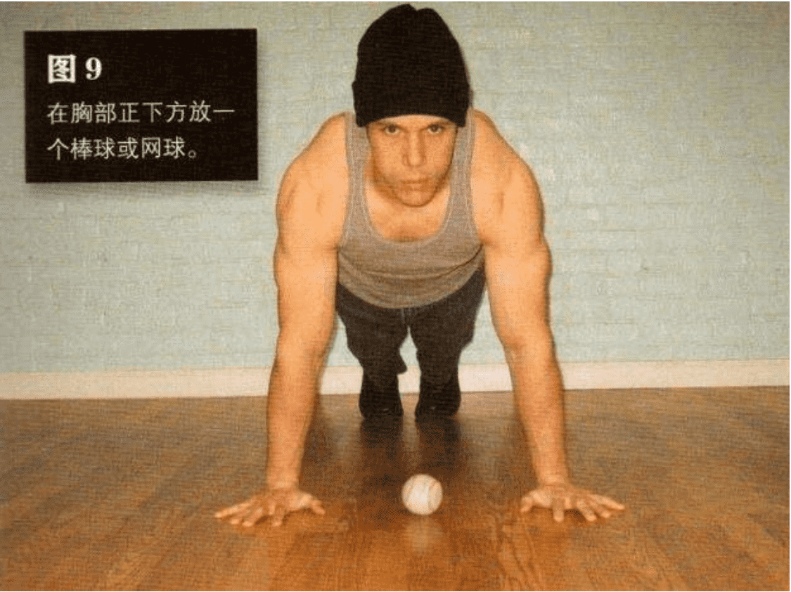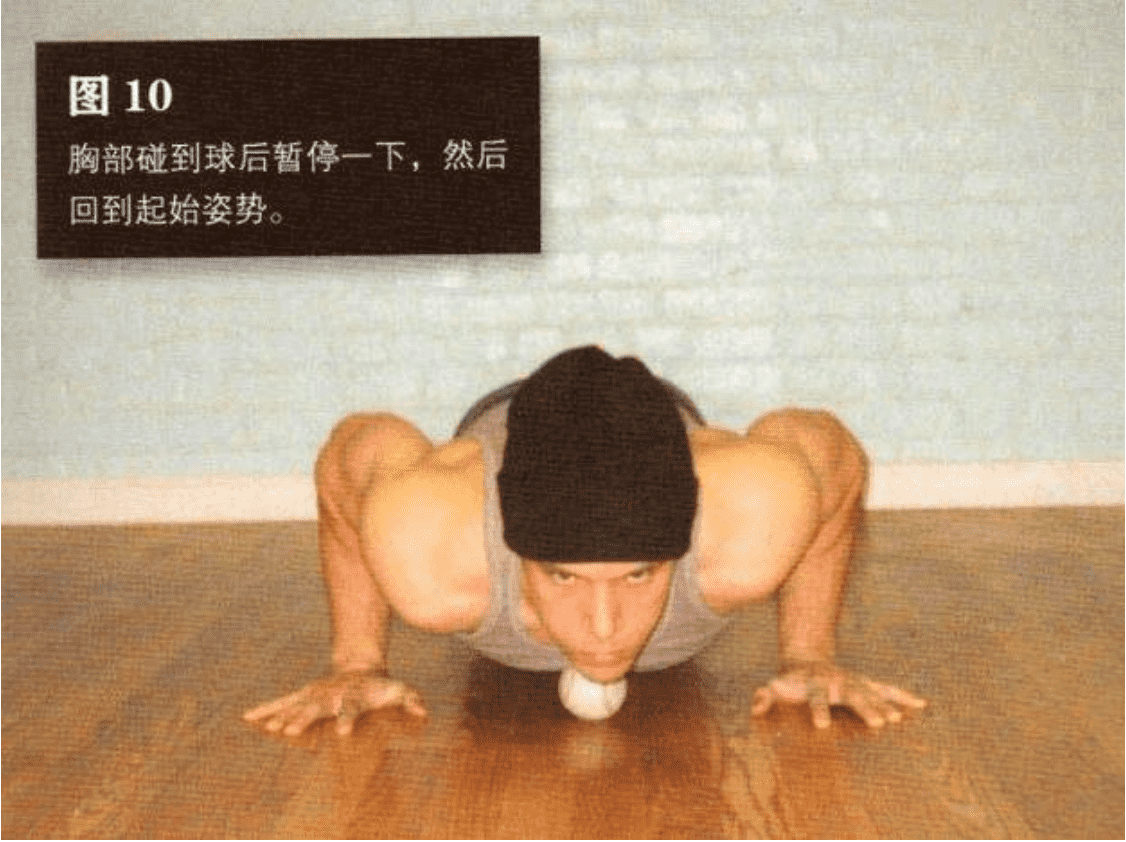 数即可若你是单独锻炼,又想控制动作幅度,并想让身体与地面保持正确距离,可以在胸部正下方放一个棒球或网球(图10)。