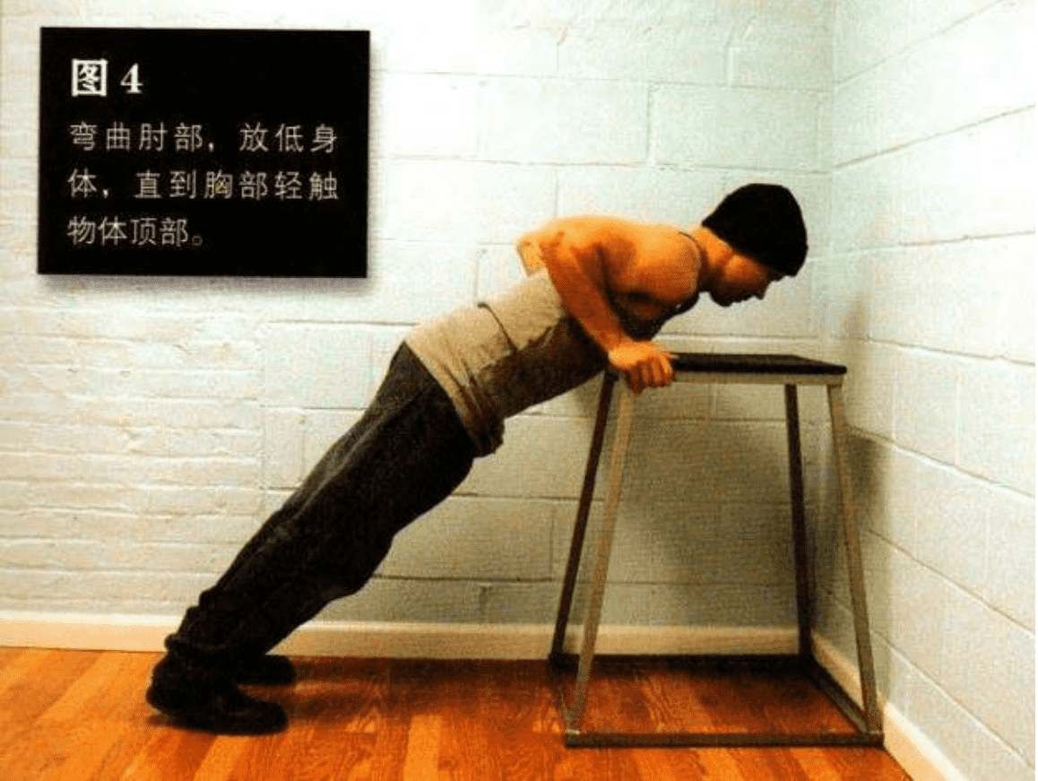 弯曲肘部,放低身体,直到胸部轻触物体顶 部。如果你选择的物体高度合适,那么此时你的 身体与地面的夹角约为 45°(图 4)。