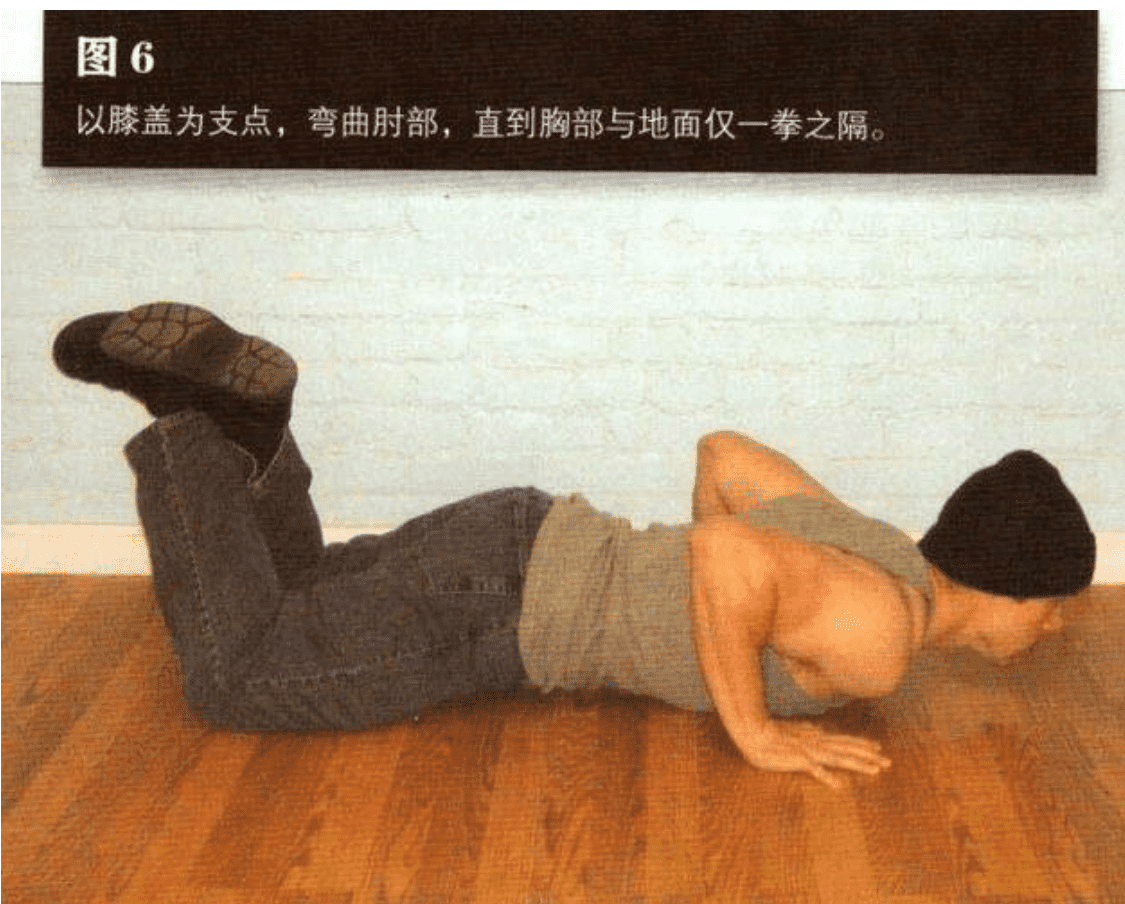 然后以膝盖为支点,弯曲肘部,直到胸部与地面仅一拳之隔(图 6)。