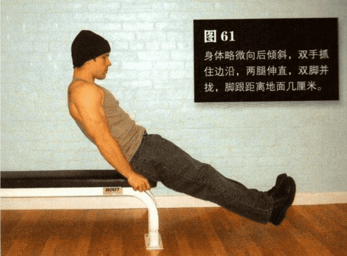 坐在椅子或床的边缘,身体略微向后倾斜,双手抓住边沿,两腿伸直,双脚并拢,脚跟距离地面几厘米。。这是该动作的起始姿势(图 61)。
