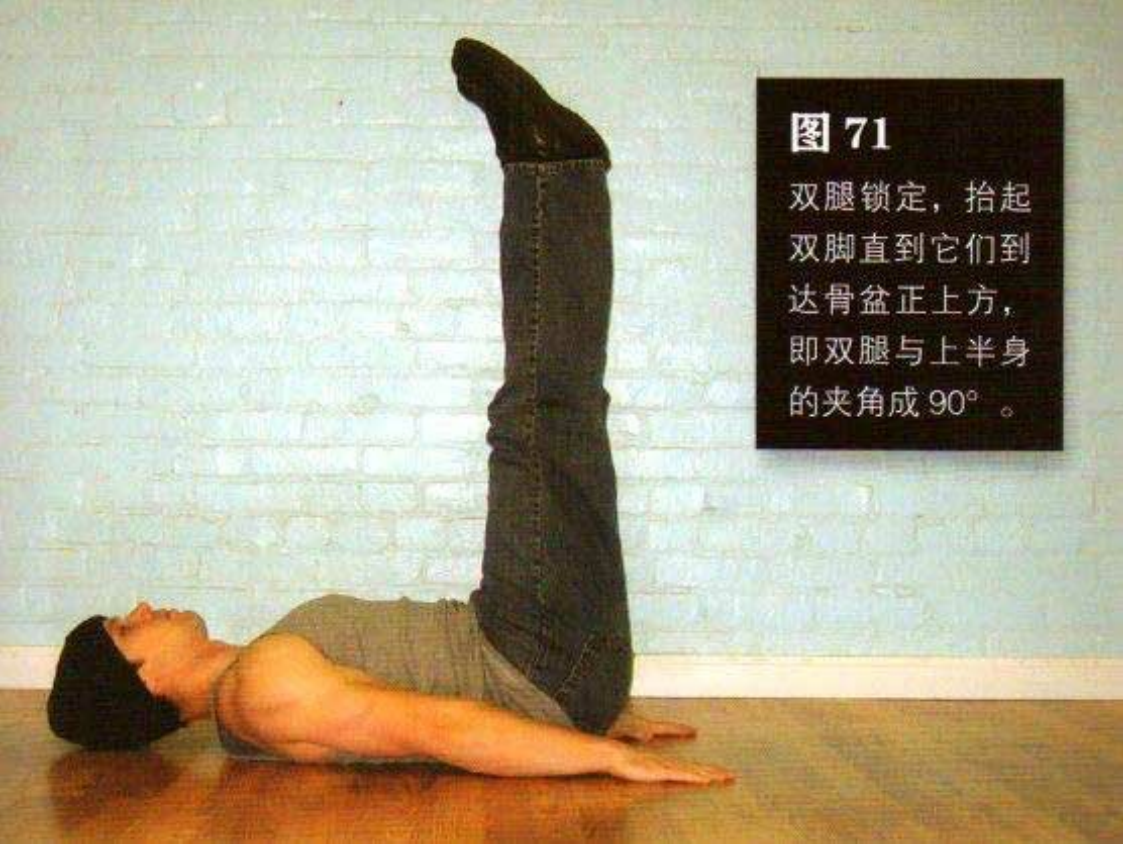 双腿锁定,抬起双脚直到它们到达骨盆正上方,即双腿与上半身的夹角成 90°这是该动作的结束姿势(图 71)。