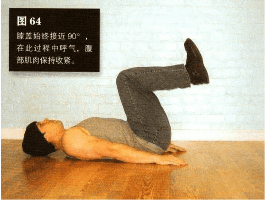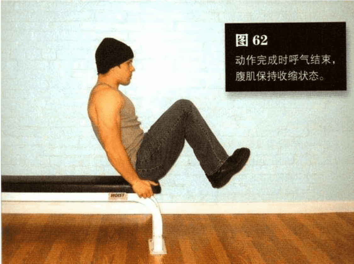 平缓地抬起膝盖,直到膝盖距胸部约 15 一 25 厘米。在此过程中呼气,动作完成时呼气结束,腹肌保持收缩状态。这是该动作的结束姿势(图 62)。