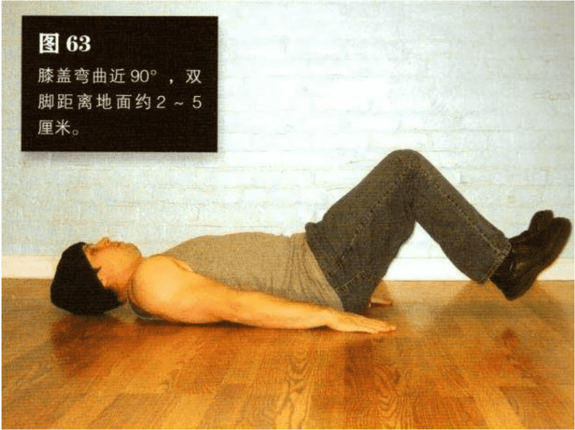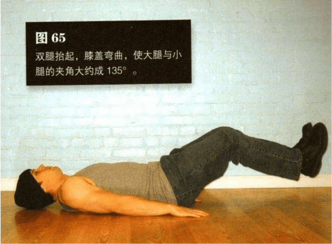 双腿抬起,膝盖弯曲,使大腿与小腿的夹角大约成 135°双脚距离地面约 2 一5 厘米。这是该动作的起始姿势(图 65)。