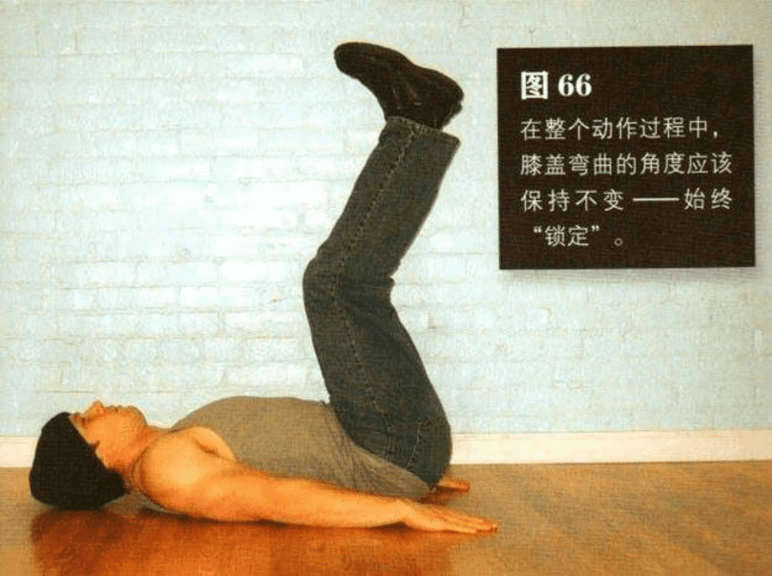 该练习前半部分的动作包括平缓地抬起双腿和双脚,持续大约 2 秒钟,直到双脚位于骨盆正上方(图 66)。