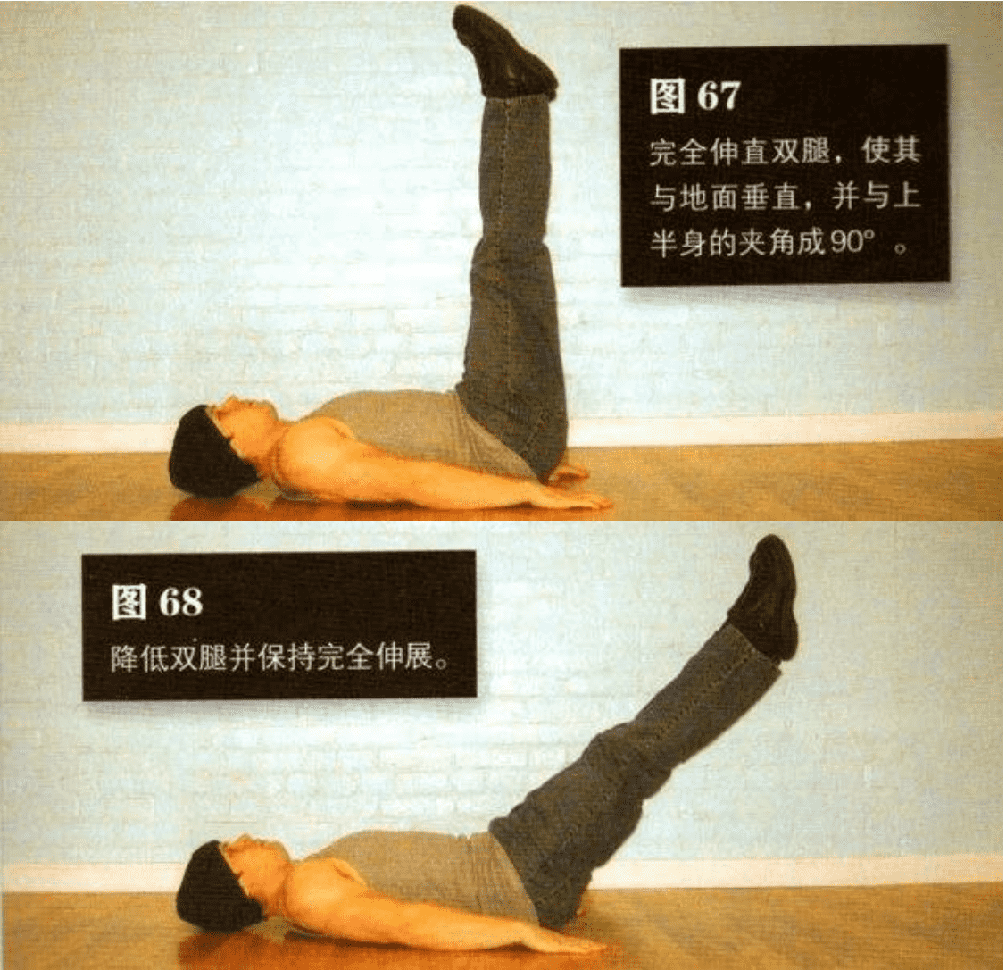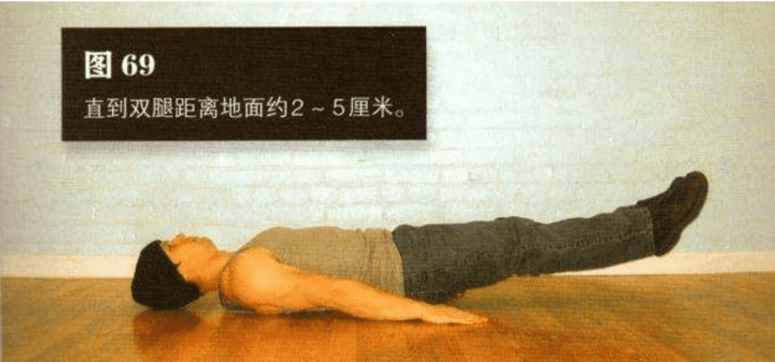 降低双腿并保持完全伸展(图 68),直到双腿距离地面约 2-5 厘米(图 69)。