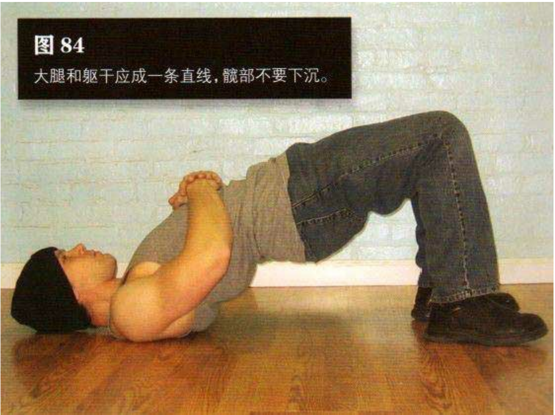 然后双脚用力下压,身体向上拱起,使髋部和背部离开地面,直到仅以双肩和双脚支撑整个身体。此时,大腿和躯干应成一条直线,髋部不要下沉。这是结束姿势(图 84)。
