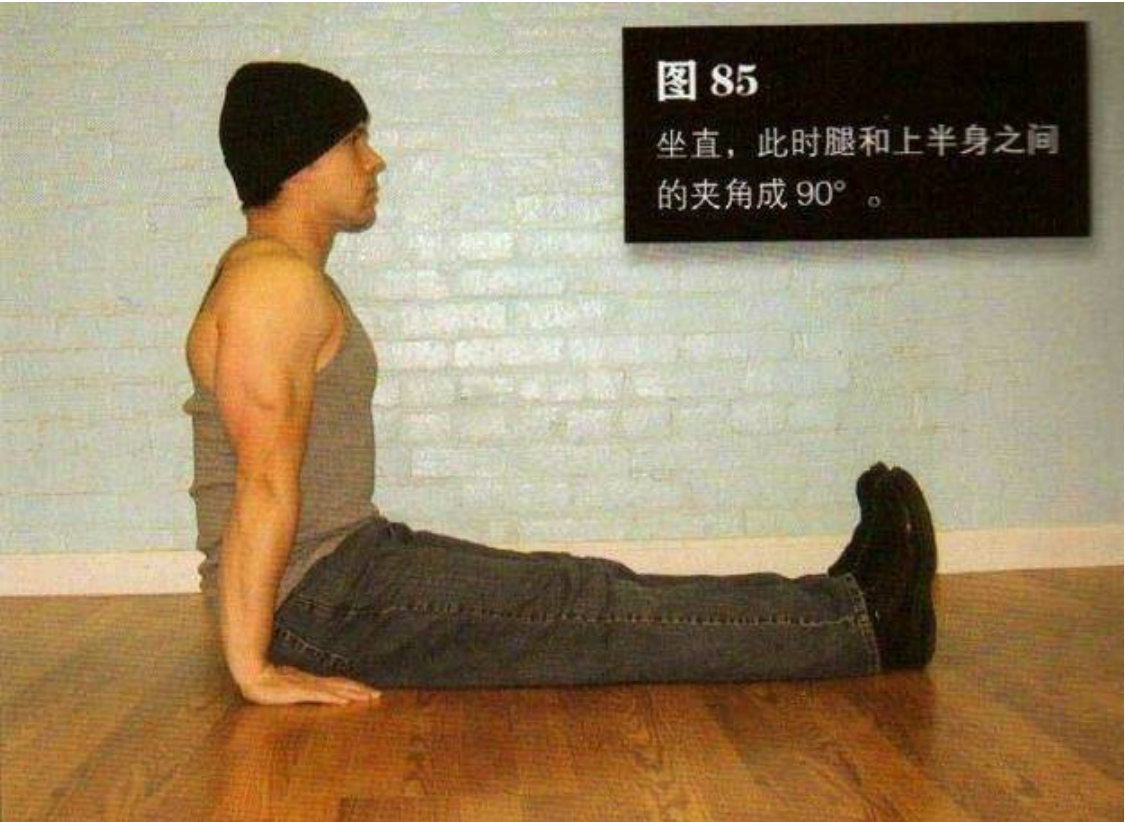 手掌平放在髋部两侧的地上,手指朝前。坐直,此时腿和上半身之间的夹角成 90°这是该动作的起始姿势(图 85)。