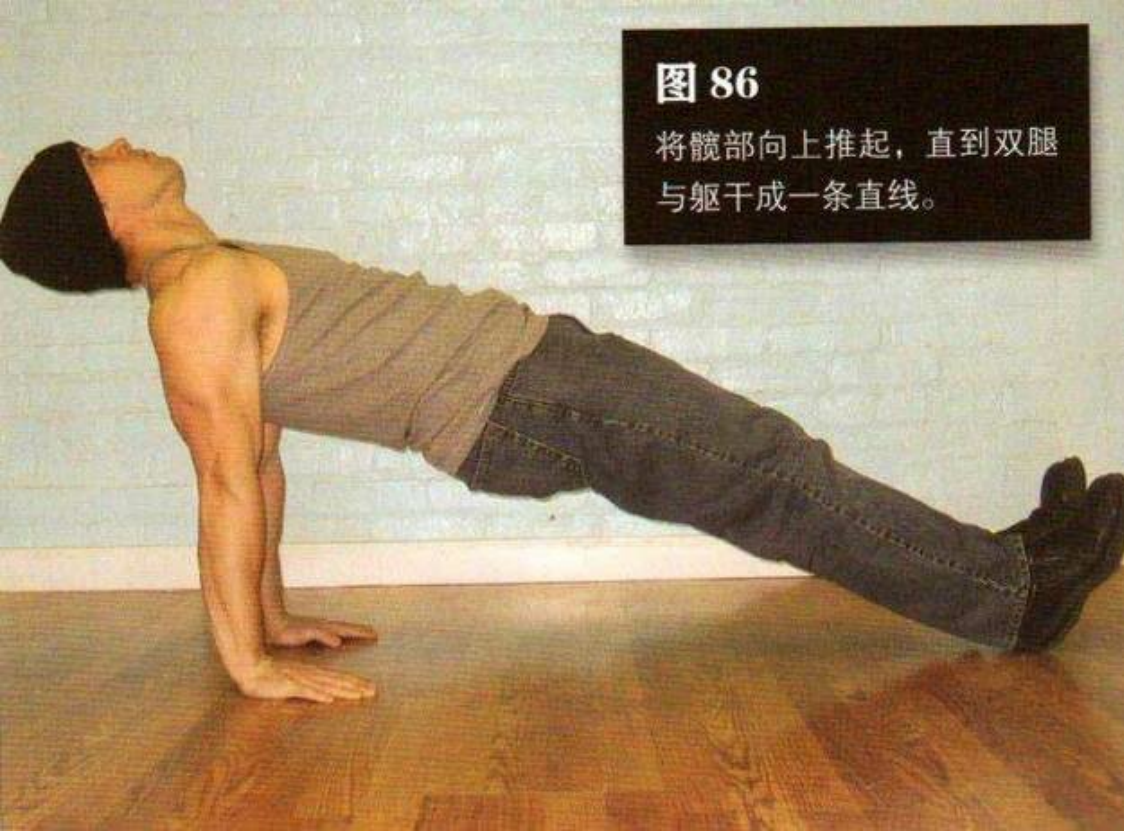 双手用力下压,双臂绷紧,同时将髋部向上推起,直到双腿与躯干成一条直线。