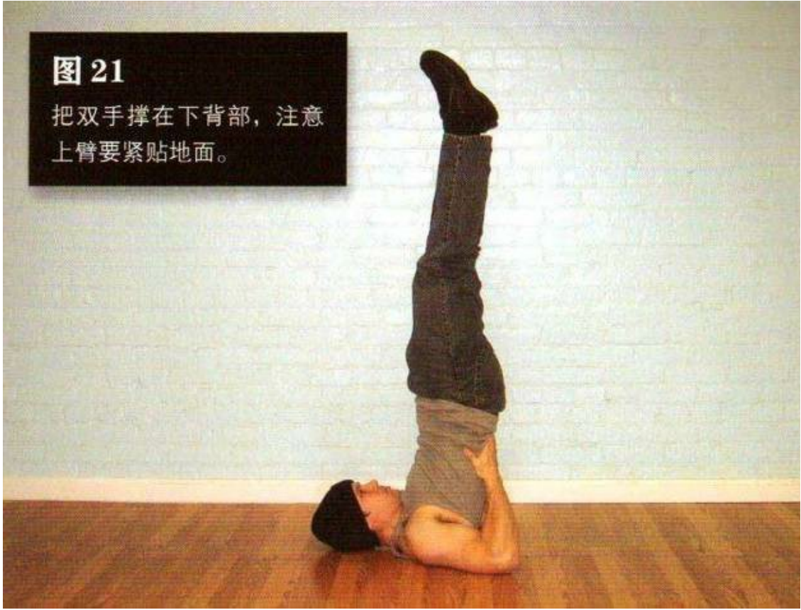 你 现在摆出的姿势是肩倒立—靠双肩、上背部以及 上臂支撑身体。