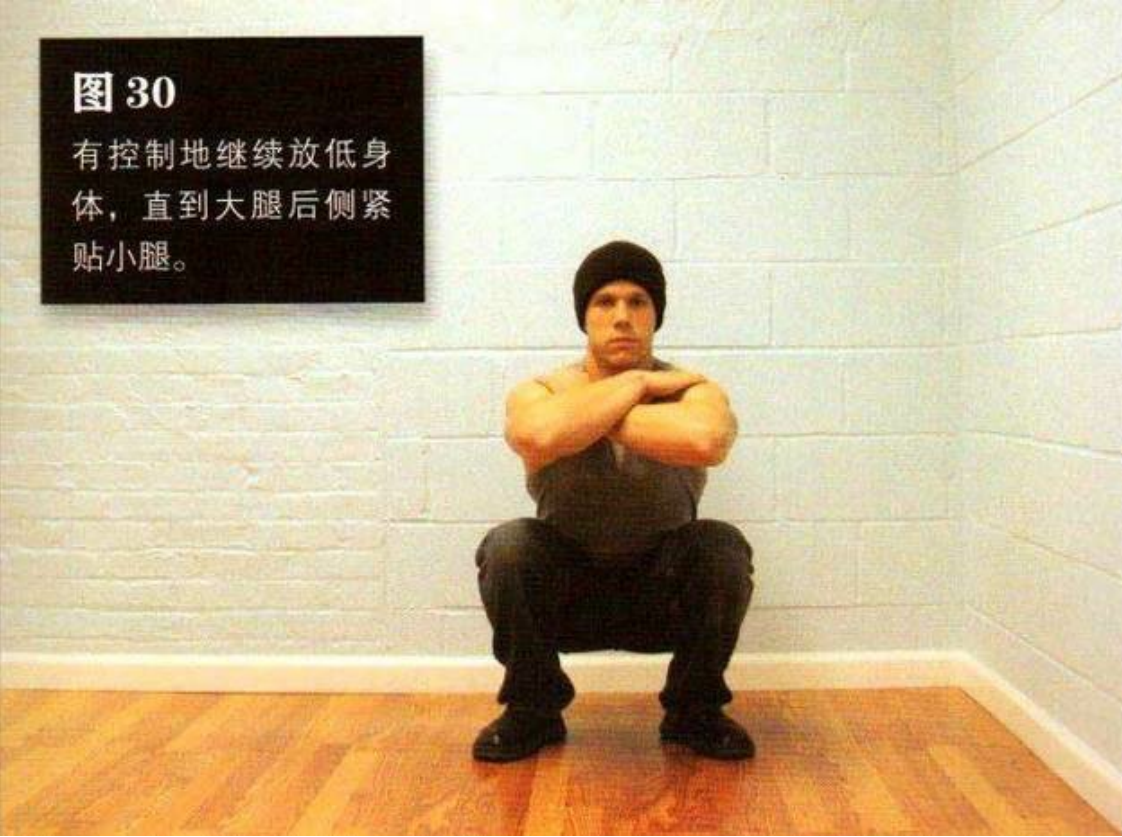 当大腿达到几乎与地面平行时,把你的身体重心向后转移,就像要坐下一样。有控制地继续放低身体,直到大腿后侧紧贴小腿。这是该动作的最低点(图 30)。
