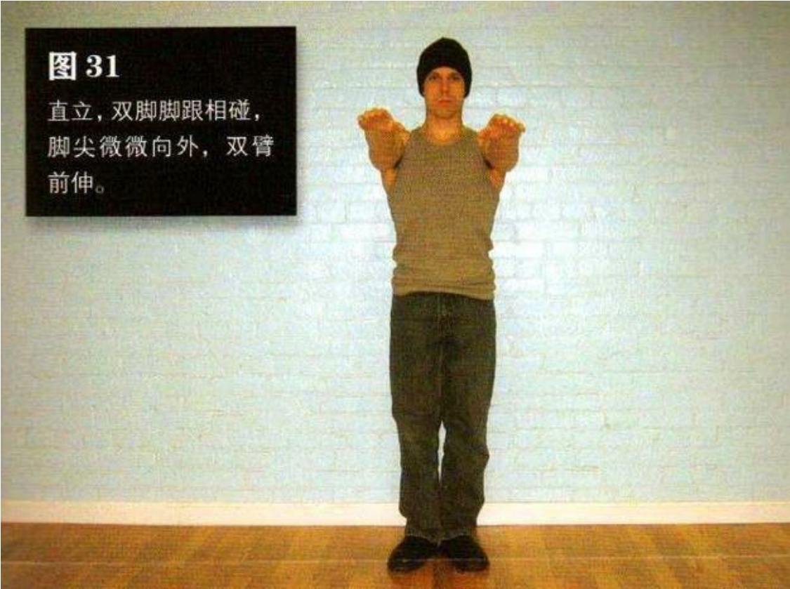 直立,双脚脚跟相碰,脚尖微微向外,双臂前伸。这是该动作的起始姿势(图 31)。