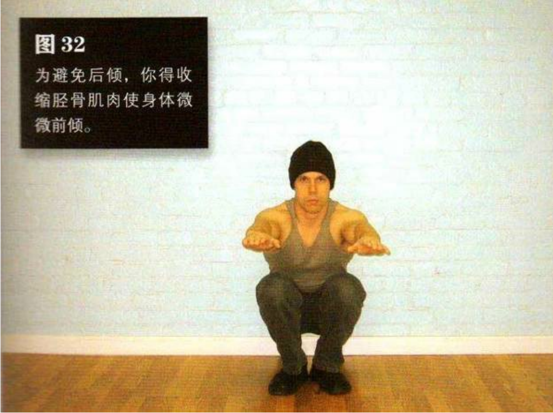 弯曲膝盖和舰部,直到大腿后侧紧贴小腿,无法蹲得更低为止。此时,你的胸部应该紧贴大腿(图32)。