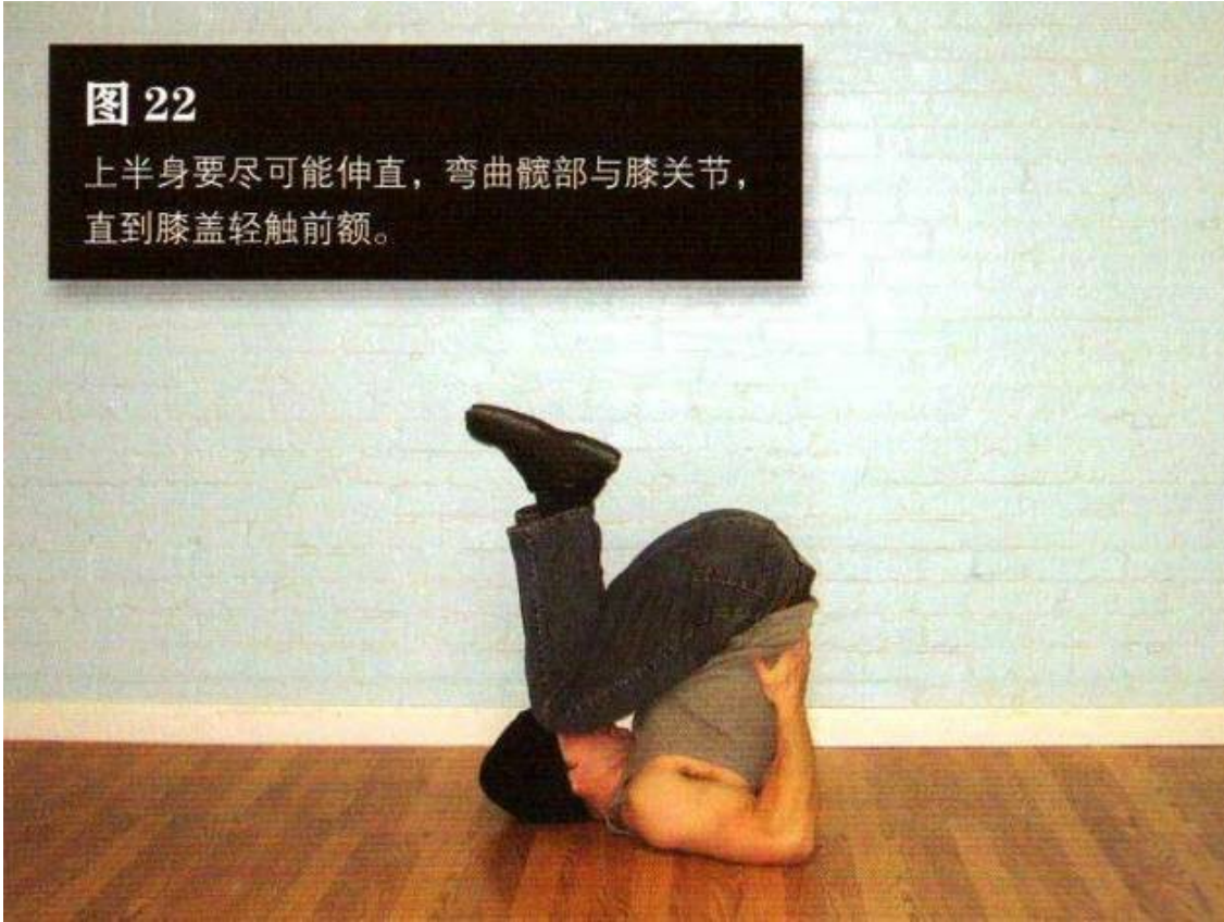 上半身要尽可能伸直,弯曲髋部与膝关 节,直到膝盖轻触前额,这是该动作的结束姿势 (图 22)。