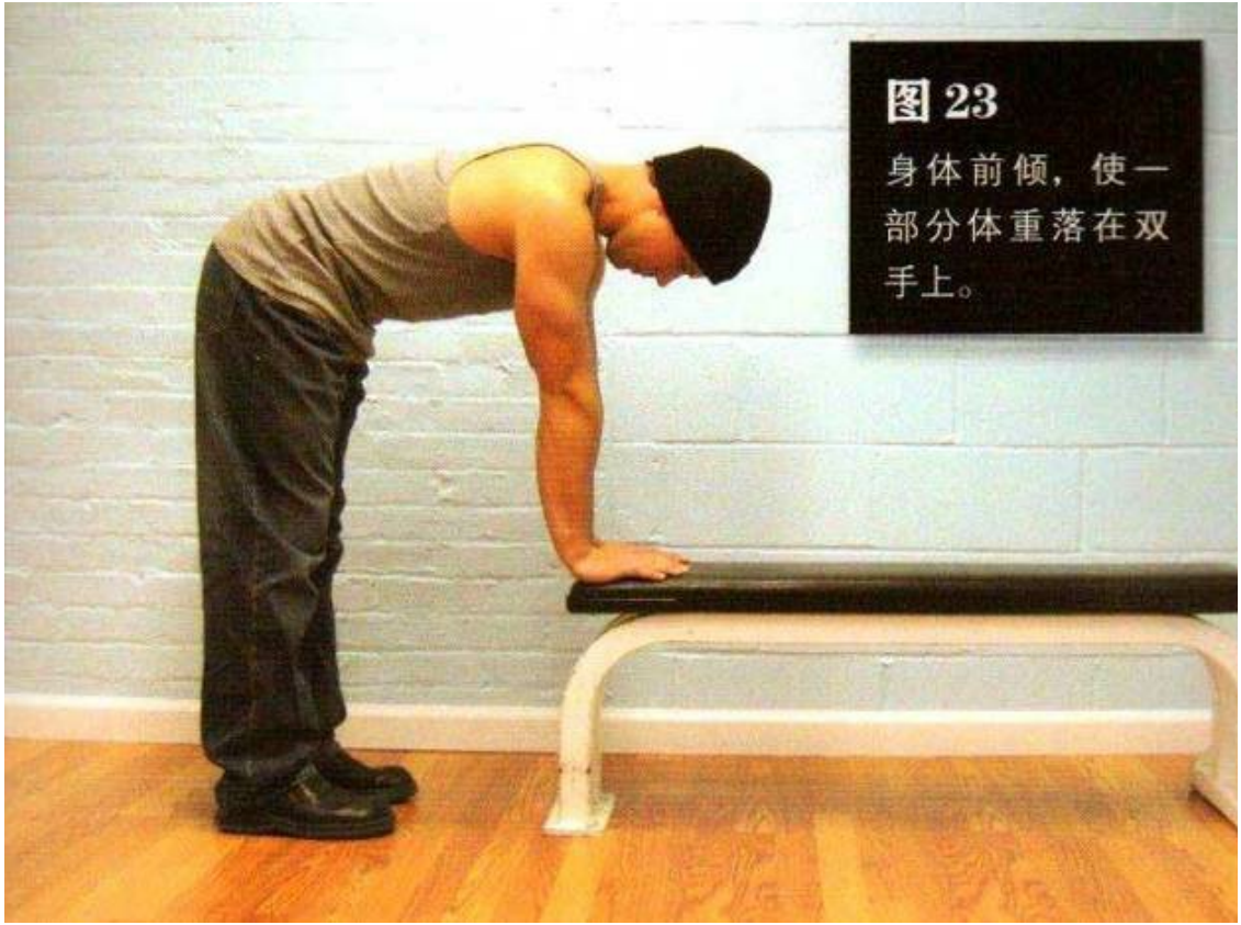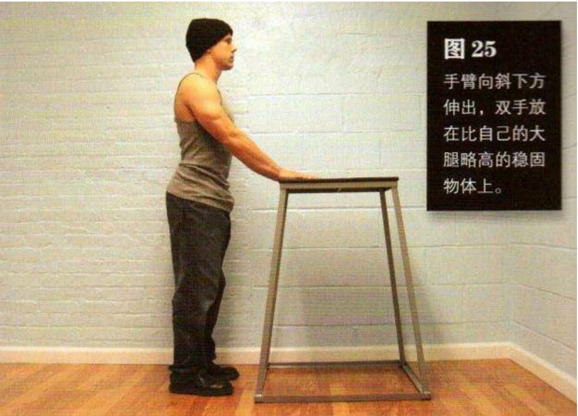 手臂向斜下方伸出,双手放在比自己的大腿略高的稳固物体上,书桌、高脚凳或椅背都可以。这是该动作的起始姿势(图 25)。