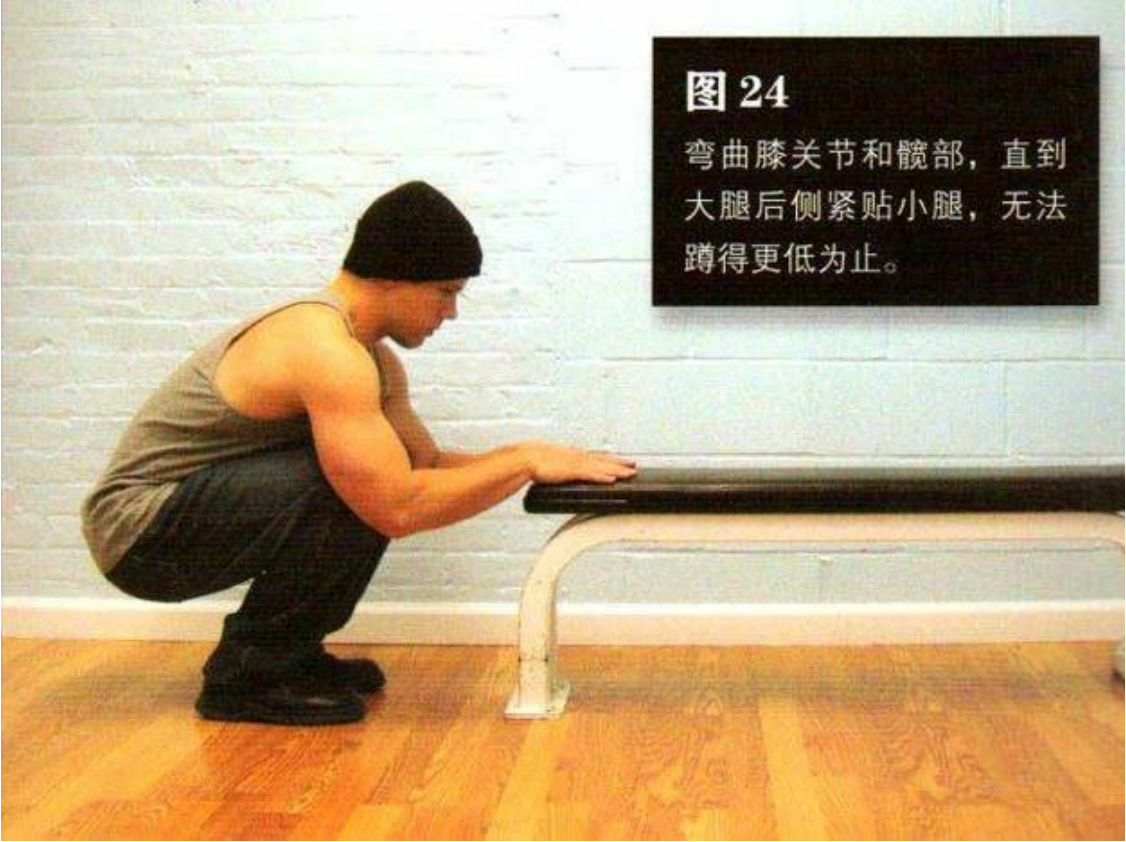 上半身尽量与地面平行,弯曲 膝关节和髋部,直到大腿后侧紧贴小腿,无法蹲得更低为止。这是该动作的最低点(图 24)。