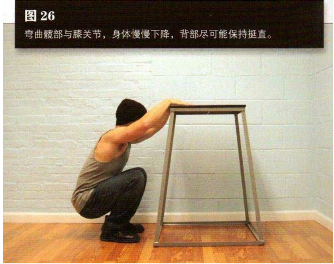 弯曲髋部与膝关节,身体慢慢下降,背部尽可能保持挺直,直到大腿后侧紧贴小腿,无法蹲得更低为止,这是该动作的最低点(图 26)。