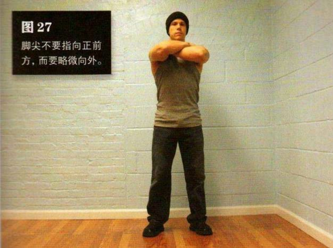 膝盖与脚尖应该始终朝向同一方向,深蹲时膝盖绝不要向内转,脚尖指向外有助于你做到这一点。