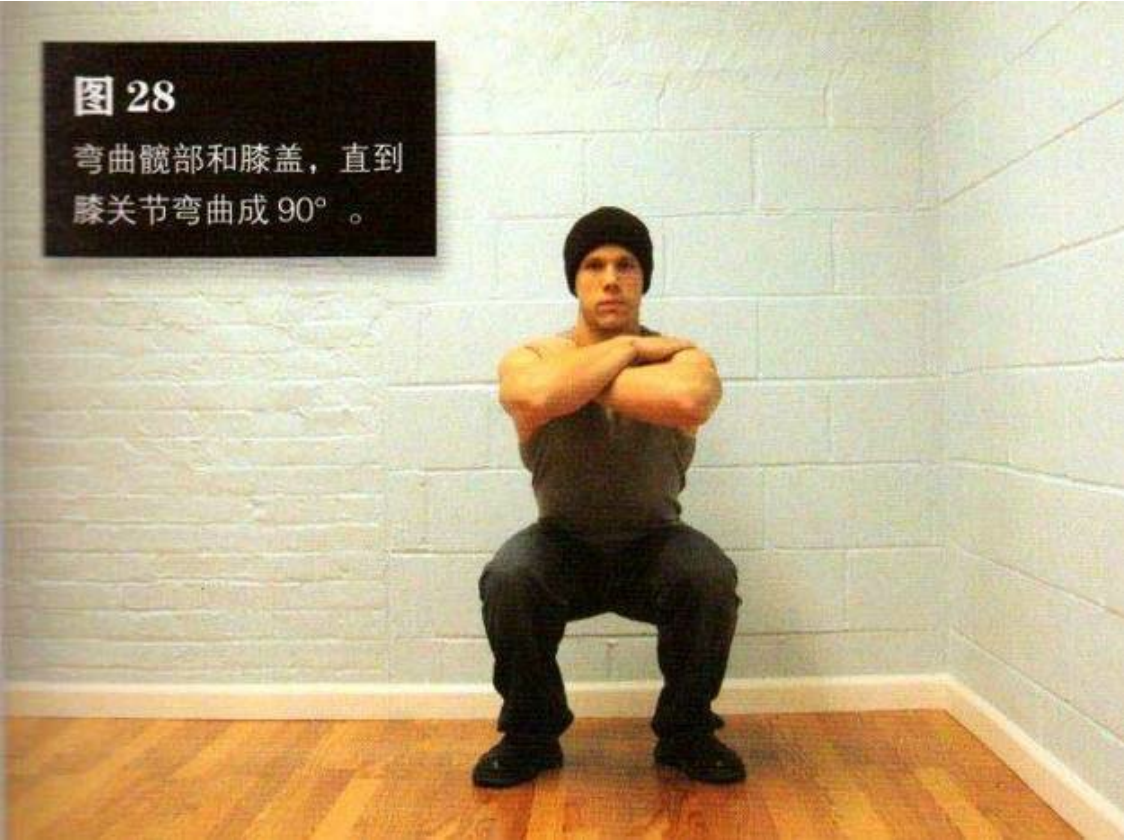 弯曲髋部和膝 盖,直到膝关节弯曲成 90°—换句话说就是大腿与地面平行。这是该动作的最低点(图28)。