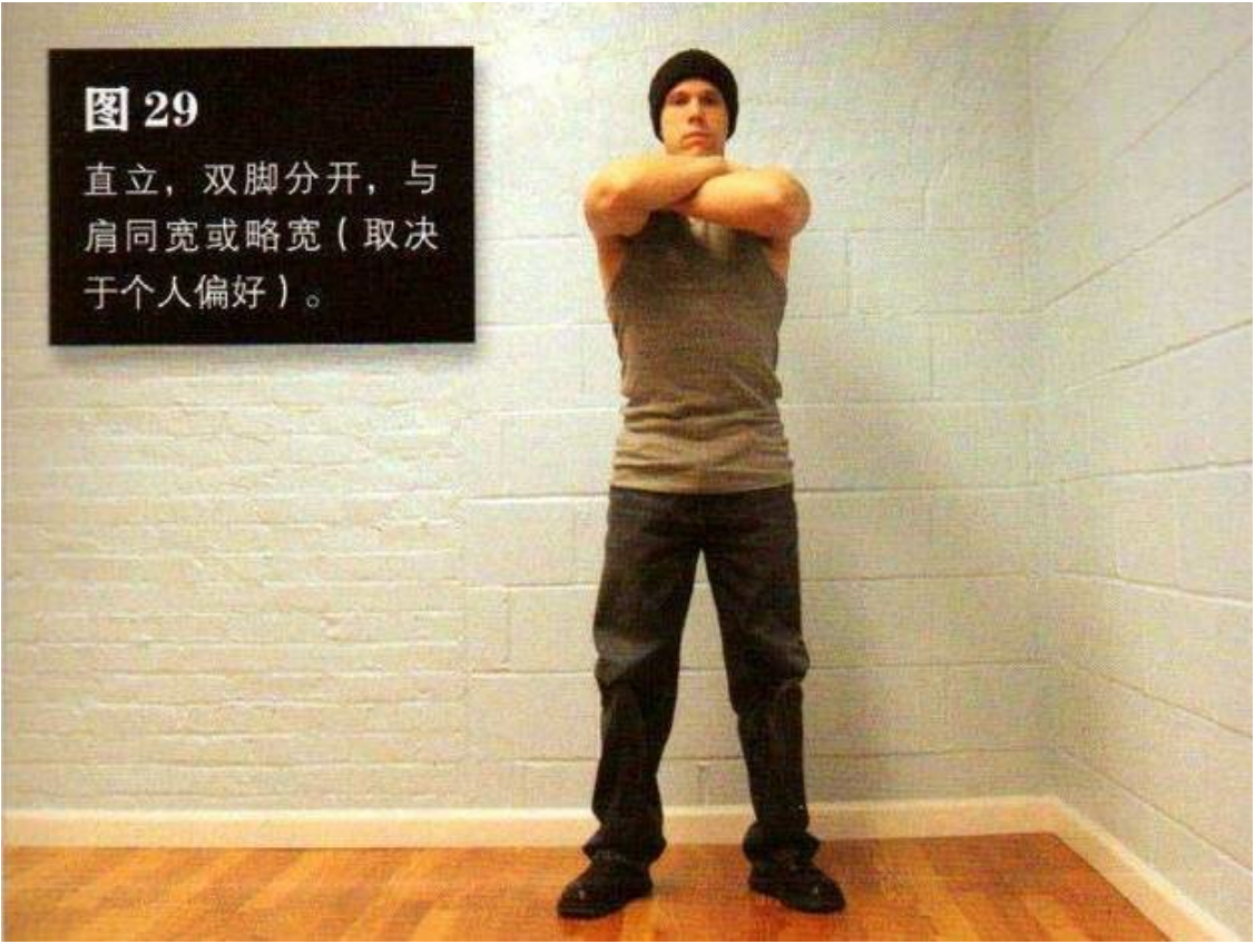 双脚略微向外转,双臂随意摆放,只要舒服即可。这是该动作的起始姿势(图29)。髋部与膝关节弯曲,背部始终挺直。