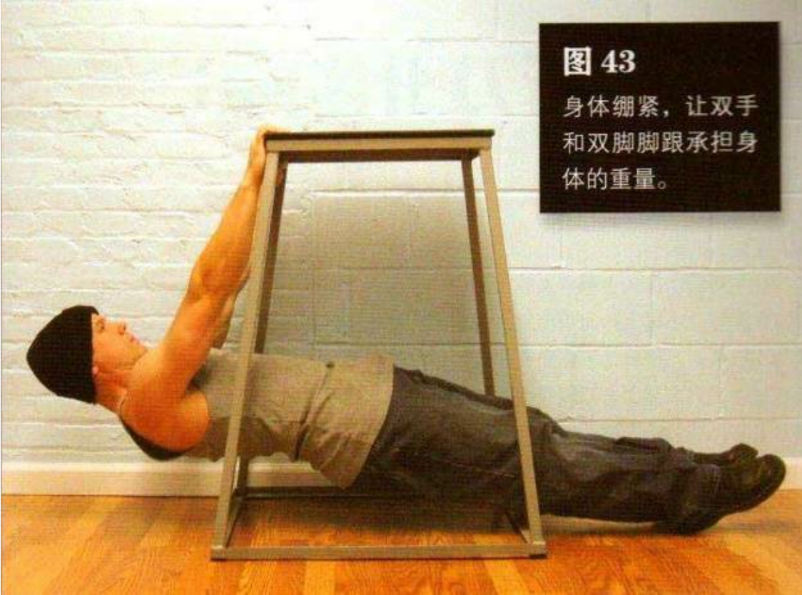 身体绷紧,让双手和双脚脚跟承担身体的重量。这是该动作的起始姿势(图 43)。