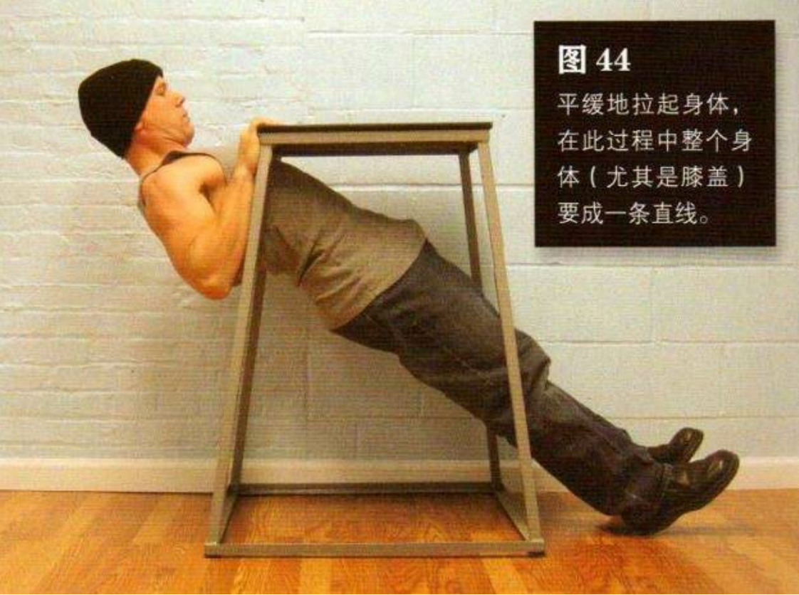然后平缓地拉起身体,在此过程中整个身体(尤其是膝盖)要成一条直线,直到胸部触到桌子边缘。这是该动作的结束姿势(图 44)。